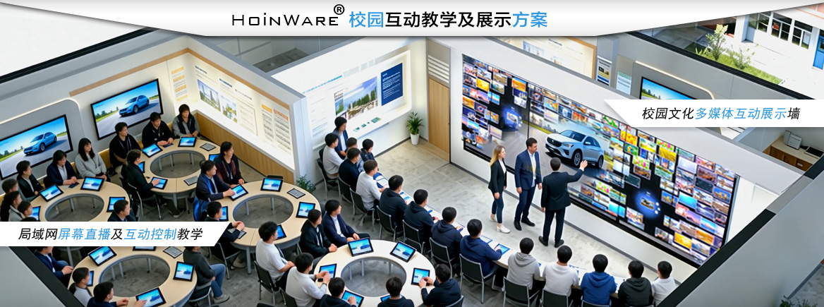 该方案为学校量身打造一套集互动教学与文化展示于一体的智慧校园互动解决方案。基于HoinWare®先进的交互软件技术,实现局域网内的高清音视频直播、远程桌面控制以及多媒体内容的多人触控互动,全面服务于课堂教学与校园文化建设两大核心场景。