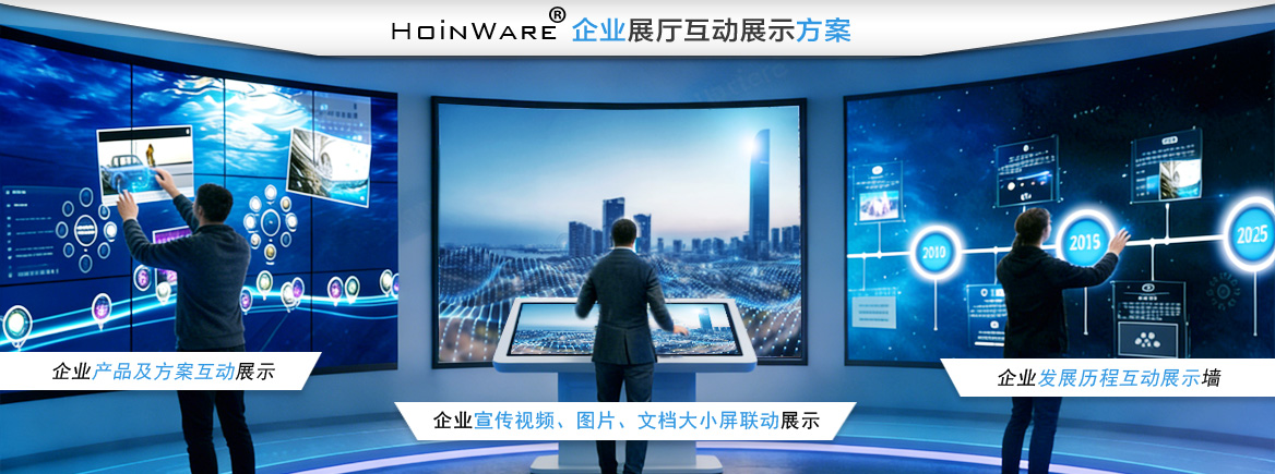 基于HoinWare®多屏幕互甩交互技术,支持宣传内容在触摸屏、拼接大屏及触控终端之间的无缝切换与协同展示,实现“小屏操控、大屏呈现”的联动效果,增强视觉冲击力与信息传递效率。