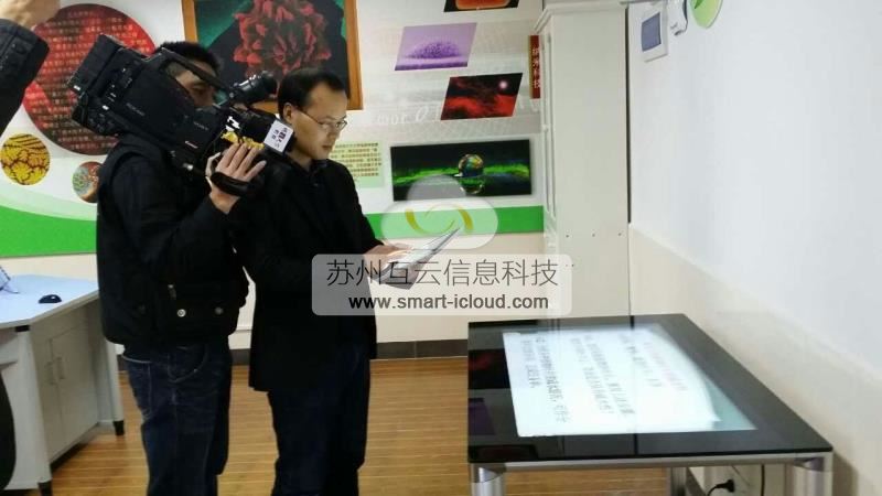 向央视记者展示平板电脑与触控桌之间的信息联动